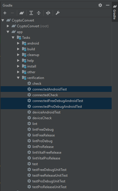 The highlighted Gradle tasks will run the Espresso UI tests for your app. There is a generic one called “connectedAndroidTest” which will run the UI tests for all flavors. There’s also a task for each specific flavor of your app. In my case I have two flavors for CryptoConvert – ‘Free’ and ‘Pro’.