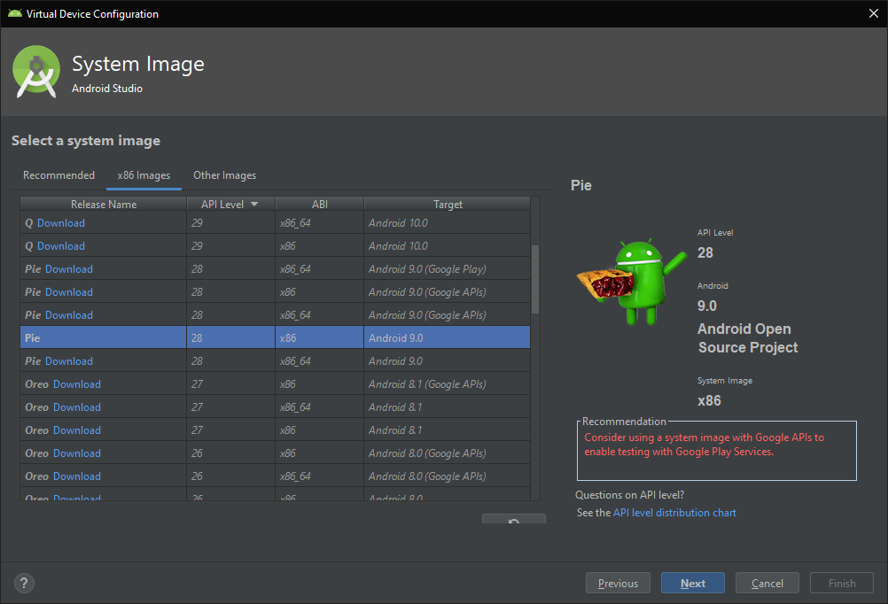 So instead of the usual system image you’d select in the “Recommended tab” when creating a new emulator, you can use the open source system image. In fact, you can ignore any system images in the “Recommended” tab, or anything that has the text “(Google Play)” next to the Android version number. Switch to the “x86 Images” tab or the “Other Images” tab to find a system image that works for you.